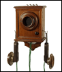 aus Holz. Der Apparat enthält einen Wecker, Induktionsspule und