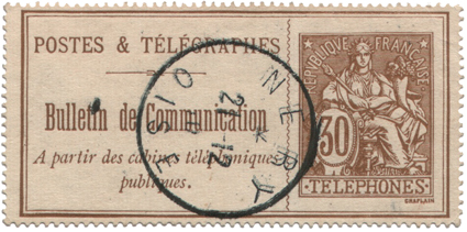 Marke für Telephongespräche auf kurze Entfernungen ohne Zeit zu 30 Centimes , braun.