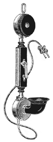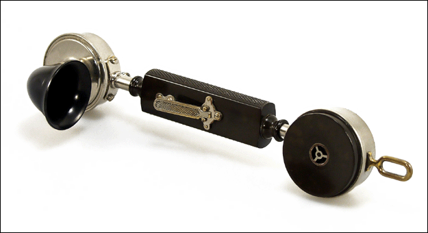 Mikrotelephon mit verziertem Druckknopf , vierkantigem geriffeltem Griff, Einsprachtrichter und Aufhängeöse.